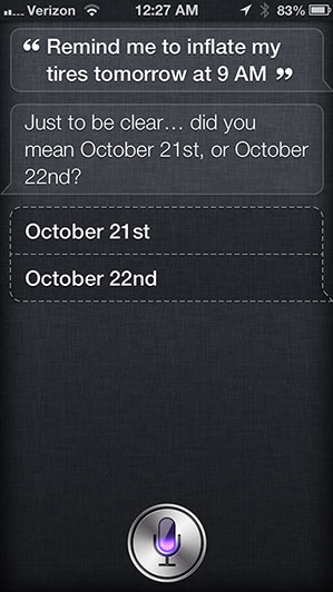 下图是用户要求苹果手机的siri“明天”9点提醒用户,看下时间是12:27AM,所以siri要求用户明确“明天”是21号还是22号。避免了用户的错误操作。