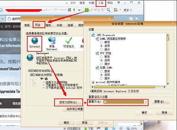 通过上边的查看网页源代码,我们可以复制到网站的内容,但是有的时候,源代码的网站内容中总是会还有大量的CSS样式、JS代码、HTML标签等。要不从源代码里复制的内容放到自己的网站上还得手动清除多余的内容,实在麻烦。这时我们完全可以修改internet选项来禁用网站禁止复制的功能代码,从而达到我们直接能在网站上复制的目的。单击IE浏览器的“工具”——“internet选项”——“安全”,将“internet”的安全级别设为最高级别,“确定”后刷新网页即可。原理其实很简单,当安全级别最高的时候,一切控件和脚本均不能运行,而网站建设的禁止复制功能往往都是通过脚本实现的,操作如图: