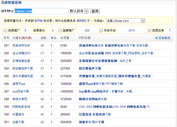 还有一个问题就是我们网站的某些词并没有进入站长工具的数据库中,站长工具就没有统计这个词的指数是多少,这个词在你网站的排名是多少,所以后来站长工具添加了一个“添加新词”的功能,如上图的右上角。